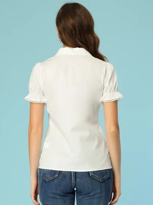 The solid frilled top with a doll collar and the turn down neck details shows off your charming and cuteness. Suitable for any cool-weather situation, this shirt will bring you a different sense. Get this bubble short sleeve top to add to your wardrobe. Occasions: Office, Work, Daily Casual, Dating, Weekend Gathering, Coffee Shop, Outdoors, Shopping, etc.