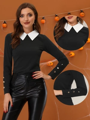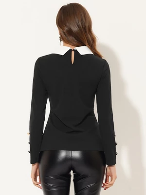 Work office shirts in fresh color with a contrast collar, add elegant feel to your daily look. This long-sleeve shirt is made of knit stretch fabric, soft and comfort, helping to finish a charming look for formal or casual look. This contrast peter-pan-collar shirt have two colors. Black one is perfect for party, while this dusty blue one is a great choice for daily or work office wear. Pair this blouse with jeans or pants for a charming, effortless look.