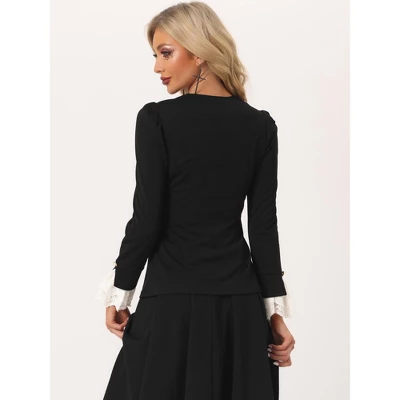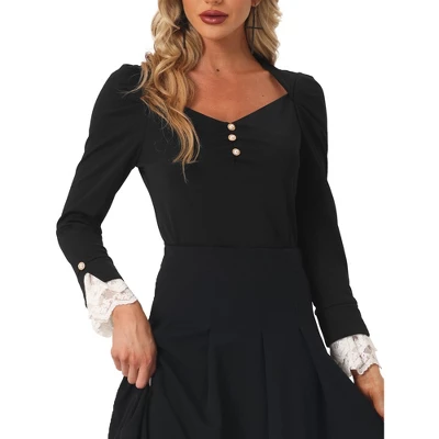 Allegra K Women’s Vintage Long Sleeve Gothic Blouse Sweetheart Neck Tops. This sweetheart-neck blouse top can become your new go-to top this season! A gorgeous top styled with a lace cuff design, and pretty decorative buttons. You can use this shirt in casual, go out, work, party, office, or in a steampunk-themed Halloween costume. Pair it with skirts or jeans for a perfect look.