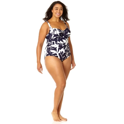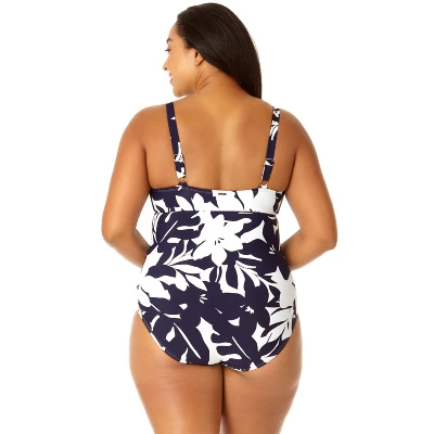 Our Plus Size Retro Twist Front Shirred One Piece Swimsuit is part of the Coastal Palm collection, which features a navy and white tropical pattern. This one piece swimsuit has a twist front detail, shirring, and removable cups to add comfort and style to your summer look. Pair this one piece swimsuit with our Button Down Shirt Swimsuit Cover Up for a breezy beach day look!
