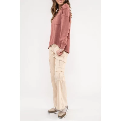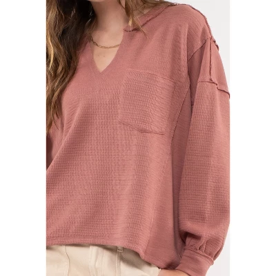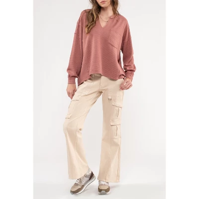 Introducing our effortlessly chic August Sky Women’s Long Sleeve Knit Top, the epitome of relaxed comfort and timeless style. Crafted with meticulous attention to detail, this versatile piece features dropped shoulders for a casual yet refined look. The banded cuffs provide a subtle touch of sophistication, while the single patch pocket on the chest adds a hint of functionality. Raw edge and top stitch details lend an artisanal feel, elevating this top from ordinary to extraordinary. The split neckline offers a modern twist, enhancing its contemporary appeal. With a relaxed fit that drapes gracefully, this knit top is a wardrobe essential for any occasion, seamlessly blending comfort and fashion-forward design.