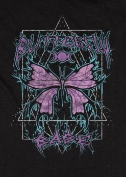 Fly into comfort with this Distressed Metal Butterfly night shirt. The shirt features an image of a purple butterfly on a metal frame while violets surround the creature. The tee comes in a black heather short sleeve crop top. Butterfly fans will love this comfy night shirt.
