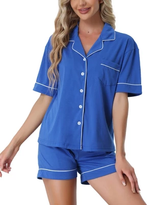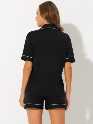 - It features a button front with a camp collar and shorts with an elastic waist design
