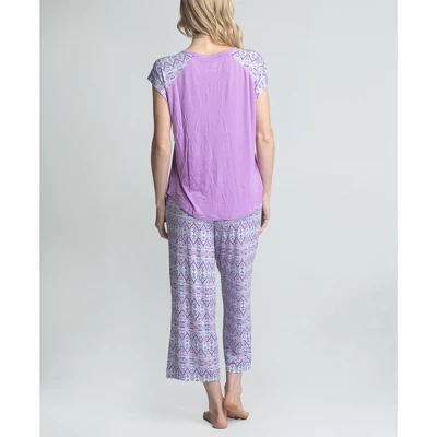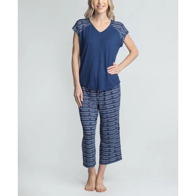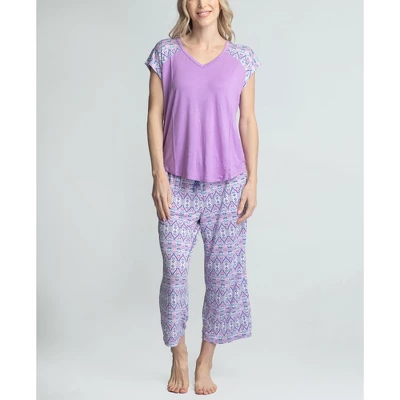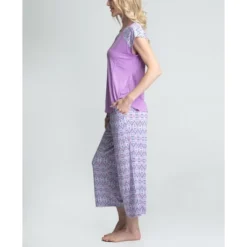 A sleep and lounge sets that features our softest and most deluxe rayon spandex fabrication we call Petal Knit. The top features a contrast trim sleeve and a deep v-neck neckline. The open leg pant is soft, drapey and silky soft. The waistband is soft elastic. Pant is cropped at 25″.