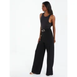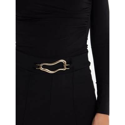 Elevate your wardrobe with the Black Scuba Crepe Trouser with Gold Buckle. These sleek and sophisticated trousers are crafted from high-quality scuba crepe fabric that offers a comfortable and flattering fit. The black color adds versatility, allowing you to style them for both formal and casual occasions. The gold buckle detail at the waist adds a touch of glamour and serves as a statement accessory. Pair these trousers with a crisp blouse and heels for a polished office look or dress them down with a tucked-in tee and sneakers for a chic weekend outfit. With their elegant design and luxurious details, these trousers are a must-have addition to your collection.