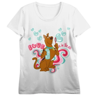 - CUSTOM DESIGN: Scooby blows heart-shaped bubbles on this graphic tee while pink letters above the character spell out, “Love Is In The Air.” Fans of the Scooby Doo cartoon will love this fun custom design.