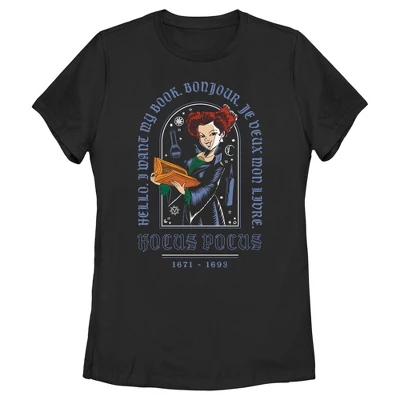 - Strut your stuff with this stylish new Women’s Classic T-Shirt that is perfect for Halloween! Winifred Sanderson is framed by the funny text “I Want My Book” in English and French across the front, alongside icons like the moon, the sun, and a potions’ bottle.