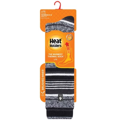 Compare with 8.6″ for Women’s Crew.Heat Holders® LITE™ thermal socks have been designed to provide our famous thermal protection and comfort in a medium thick profile, ideal for wearing in casual shoes and boots!Compared to our ORIGINAL™, maximum loop length thermal socks with 2.34 Tog rating (Thermal Overall Grade), Heat Holders® LITE™ thermal socks have a medium loop length with 1.60 Tog rating.Keep feet warm on the coldest of days and pull on this pair of stripe pattern, medium thickness, long length Heat Holders® LITE™ for women, the warmest thermal sock.Heat Holders® are made from a specially developed heavy bulk yarn which has extreme thermal qualities. With medium pile cushioning, these thermal socks will help keep feet fully comfortable and supported.The inside of each sock has been intensively brushed, such that they not only feel sensationally soft but also trap warm air close to the skin keeping your feet warmer for longer.Heat Holders® are non-binding; they are also diabetic friendly and provide relief for cold feet due to circulation problems.